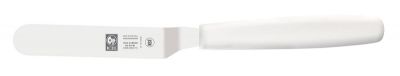 Модель имеет изогнутую форму. Изделие оснащено эргономичной ручкой белого цвета из полипропилена, устойчивого к высоким температурам и внешнему воздействию, и рабочей частью, выполненной из высококачественной нержавеющей стали с добавлением хрома, молибдена и ванадия.