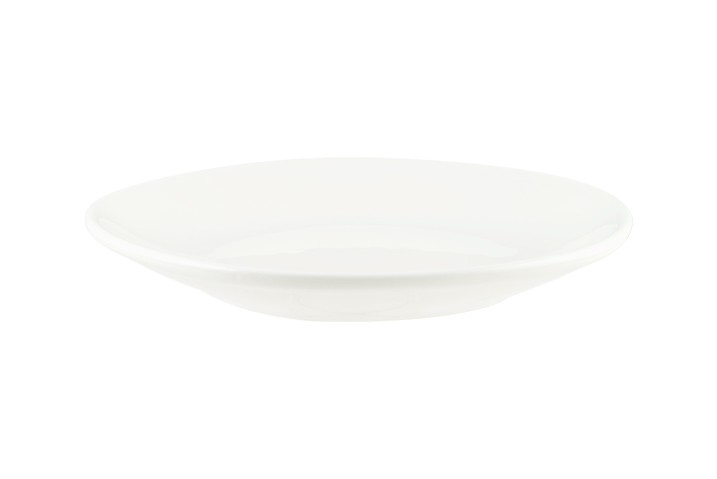 Тарелка белого цвета со сливочным оттенком.