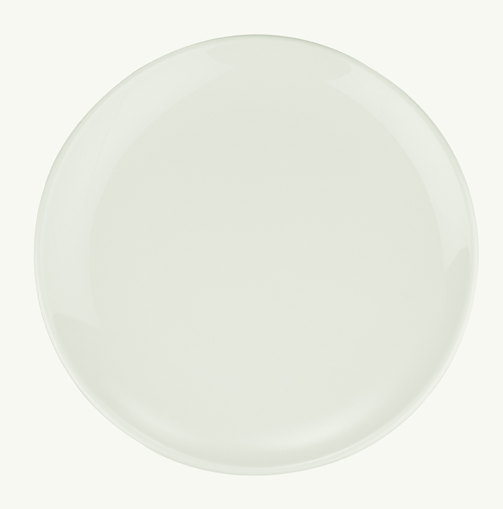 Тарелка белого цвета со сливочным оттенком.