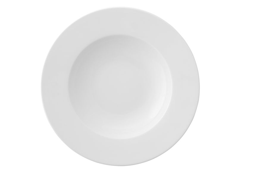 Тарелка белого цвета со сливочным оттенком.