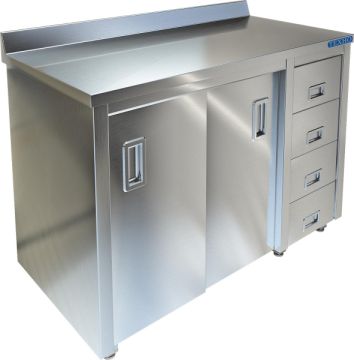 Материал каркаса: Нерж. сталь AISI 304; Материал столешницы: Нерж. сталь AISI 304; Борт: Да; Количество дверей: 2; Длина, мм: 1 600; Ширина, мм: 700; Высота, мм: 850; Ящики: Да;